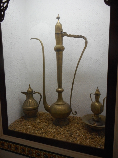 Le Musée Dar Chraït  (10DT)est installé dans un palais très richement meublé. J’ai beaucoup aimé les coffres de nacre, les aiguières de cuivre. Comme dans les autres musées tunisiens que nous avons vus il y a des reconstitutions de scènes de mariage avec des mannequins richement habillés, la scène du henné, les contrats de mariage, les musiciens (sonorisés). Dans des vitrines on présente des costumes. Les appartements que le Bey occupait en 1881 sont reconstitués avec la vaisselle et les armes d’apparat. La visite se termine par une exposition de peintures contemporaines assez peu convaincante.