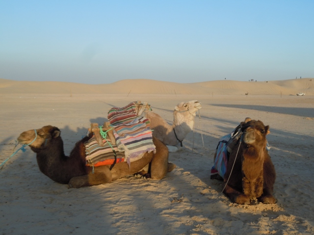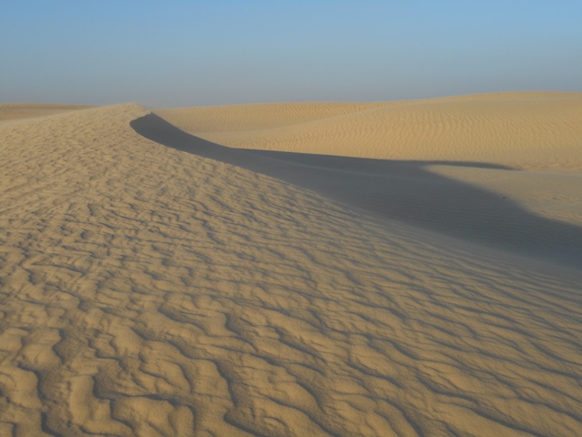 C’est une dune très connue surtout pour avoir été le site de tournage de Star Wars (il y en aura d’autres que nous visiterons. Je ne suis pas fan de la guerre des Etoiles, les décors avec des robots de pacotille ne me branchent pas. Encore moins les malheureux fennecs que les enfants tiennent serrés par une courte corde pour la photo. La dune serait belle si les 4×4 étaient raisonnablement sur le parking et si les touristes se déplaçaient à pied ou à dos de dromadaire. Je monte en espérant faire de belles photos dans les lueurs du soleil couchant ; hélas. A peine ai-je dégainé l’appareil photo qu’un 4×4 s’incruste dans le champ de la photo pour s’y immobiliser. Peine perdu pour photographier les rides de sable, des traces de pneu le labourent. Et voilà encore un site magnifique gâché par un tourisme imbécile.
