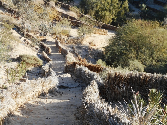 Mais où est donc la Corbeille ? Chaque fois que nous demandons aux passants,, soit il ne comprend pas soit il propose ses services comme guide au tarif exorbitant de 40 dinars. Heureusement le Guide Geo possède un plan de Nefta : il faut trouver la zone hôtelière qui devrait contourner la Corbeille. Après le dernier hôtel une flèche peinte nous conduit à un petit café qui la surplombe.