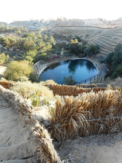 Quatre tables de plastique coloré le long d’un parapet. L’endroit idéal pour dessiner ; une vue presque à 360° sur la piscine naturelle et les jardins, les coupoles des marabouts, les minarets qui coiffent la colline. Le creux est curieusement divisé en sorte d’enclos par des haies de feuilles de palmier qui font comme des loges. Des escaliers descendent vers la piscine. Plus lion, des jardins avec des promeneurs, des cafés, des restaurants de verdure. Un endroit paradisiaque !