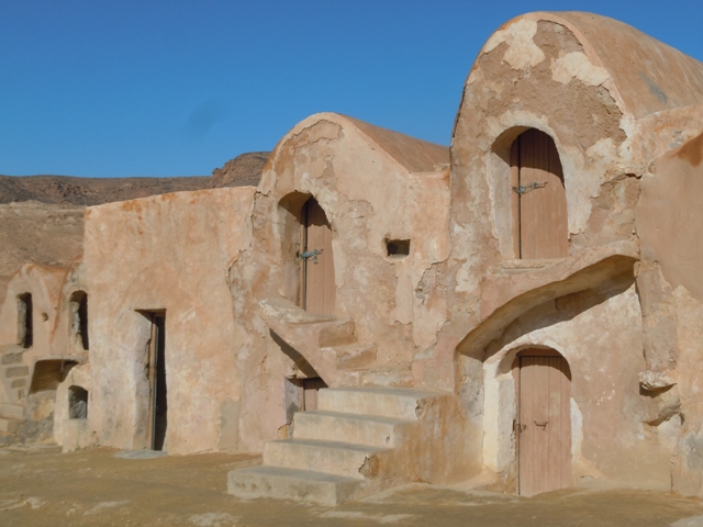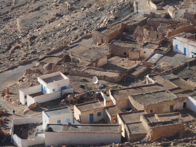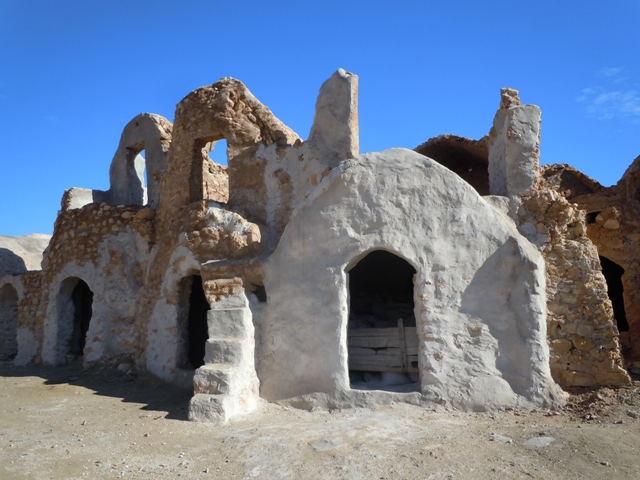 »Vous êtes arrivés ! » Clame Madame GPS à une intersection sous une mosquée blanche et un bosquet de palmier. Un homme vient à notre rencontre et indique une piste très raide. Plus haut, elle et cimentée, la voiture grimpe allégrement. Comme un gros nid de guêpes, les loges du ksar s’accumulent sur la crête. Les ksour tunisiens ne ressemblent pas aux châteaux marocains de même nom (comme le tagine à l’œuf tunisien diffère du tagine marocain). Les ksour sont des greniers. . chaque famille possède quatre loges ou gorfas, une pour le grain, une pour l’orge, une pour l’huile et la dernière pour les dattes. Ce ksar a 1300ans et fut abandonné il y a une cinquantaine d’années.