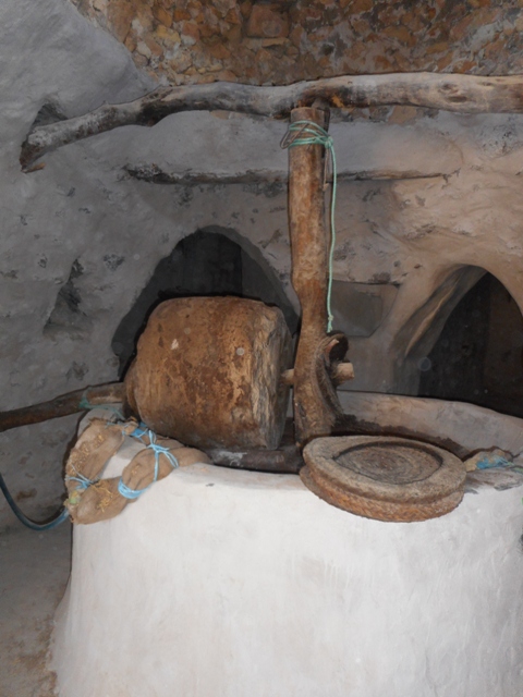 Les loges sont alignées avec le plafond en berceau, des marches d’escalier pour atteindre le niveau haut. Au fond de la cour, il y a une petite mosquée, la maison de l’imam et une huilerie. Dans la mosquée le plafond est décoré de motifs berbères et de versets du Coran. L’huilerie est construite autour d’un pressoir avec une grosse meule de pierre. Un petit dromadaire tournait inlassablement autour du pressoir pour écraser les olives. La pâte était ensuite pressée dans deux petits pressoirs dans des loges latérales. Quand le dromadaire devenait trop grand vers 10ans on l’égorgeait pour en faire un méchoui. Triste destin pour cet animal qui tournait sans jamais voir le jour !