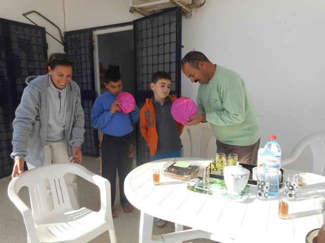 Le chien Max s’étire et nous reconnaît. Les enfants nous embrassent. La table de la terrasse est au soleil. Les enfants ont préparé une surprise pour l’anniversaire de Dominique : un joli livret avec des fleurs collées, des dessins des poèmes. MBarka apporte le gâteau d’anniversaire. Les enfants brandissent des disques enveloppés dans du papier-cadeaux violet : des plats de cuivre gravés et martelés à nos noms avec des dromadaires et des palmiers ; un beau souvenir !Nous sommes si bien ensemble que nous renonçons à la promenade prévue à El May et Midoun. L’amitié remplace le tourisme.