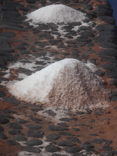 Sous un soleil radieux (et un vent terrible) nous visitons la saline : les bassins sont verts, les œillets roses ou oranges grâce à Artemisia salina le crustacé qui donne sa couleur aux flamands roses. Des petits tas blancs brillent alignés à côté des œillets bien que la saison n’ait pas encore commencé (entre Mars et Octobre).