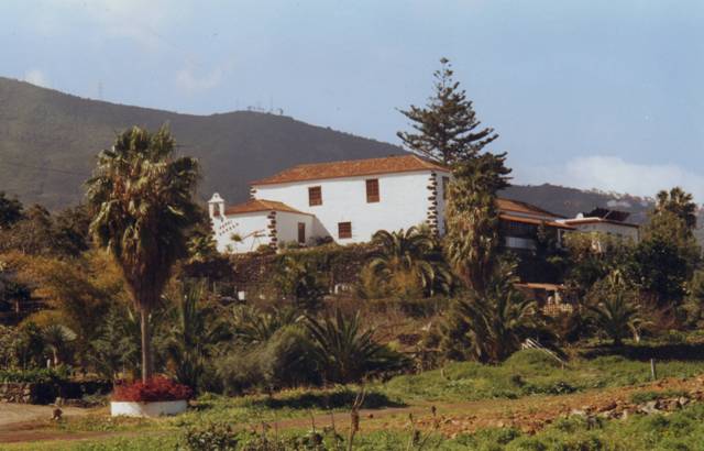 Une chapelle blanche perchée sur une petite montagne pointue, attire notre curiosité. Nous contournons la base du cône dans des jardins un peu à l’abandon : bananeraies, oignons et pommes de terre. Le long de la route,il y a de petits oratoires fermés très soignés et fleuris. Une très belle finca est cachée dans les jardins. Malheureusement de grands panneaux annoncent la construction de chalets adosados du pire effet.