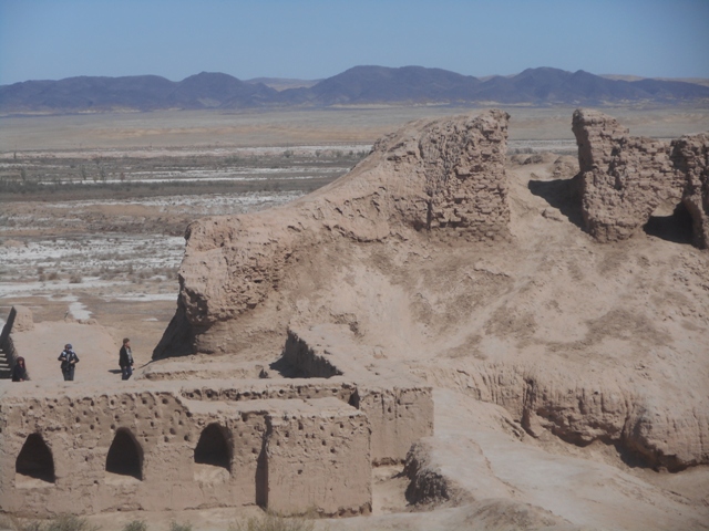 La forteresse de Toprak Kala domine la plaine de l’Amou Daria perchée sur sa colline. A l’époque l’Amou Daria avait son lit proche de la colline, mais le fleuve, l’Oxus, d’Alexandre le Grand, surnommé fleuve fou ou fleuve enragé, changeait souvent de lit.
