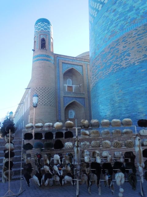 La rue qui parcourt la ville d’ouest en Est et qui passe sous le minaret inachevé est très passante, elle est occupée par les étals des marchands de souvenirs. En plus des chaussons tricotés, des foulards en soie (ou en coton), des lutrins pour le coran, des corbeilles à fruits en bois télescopiques, ou des planches à découper les légumes finement ciselées, les plus spectaculaires sont chapkas, toques, coiffures traditionnelles. L’Astrakhan est le plus renommé. La fourrure d’un agneau mort-né fournit l’Astrakan de la meilleure qualité mais les agneaux nouveau-nés donnent aussi de la belle fourrure. Il a pris le nom de cette ville de Russie, très froide qui importait beaucoup de fourrures d’Ouzbékistan. Les Ouzbeks le désignent par un autre nom : karakul. Les bergers et paysans revêtent des bonnets à longs poils de mouton qui leur donne la même silhouette que les Juifs religieux avec leur schtreimmel. On peut préférer le renard ou la fourrure de chat.