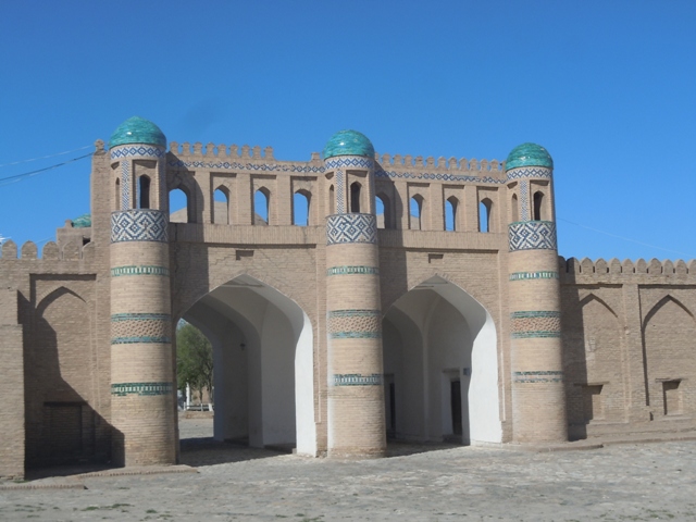 Quo’sha Darvosa est situé à quelques pas de l’arche double marquant l’entrée de la ville. Il est installé dans une maison ancienne (1901) qui possède sur une belle cour pavée autour d’un puits où s’ouvrent les portes d’une dizaine de chambres. Une grande banquette garnie de coussins colorés s’adosse au mur. Un escalier conduit à une terrasse : de là la vue est merveilleuse sur les coupoles turquoise. On nous y sert un thé accompagné de raisins secs, deux sortes, l’une dorés, l’autre presque bleus.