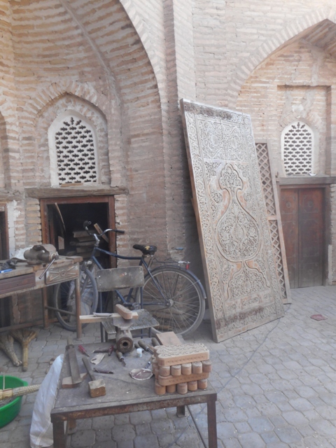 Les cours sont le plus souvent occupées par les marchands, on laisse donc entre les visiteurs dépourvus de billet (Nessim a pris les nôtres pour les visites de demain). Dès qu’il s’agit d’entrer dans les bâtiments on me chasse gentiment. Certains monuments sont occupés par des artisans : des menuisiers fabriquant des objets d’art ciselés, des portes magnifiques me laissent admirer leur travail, tout comme ceux qui sont spécialisés dans les tables et els bancs. Scies électriques voisinent avec burins et ciseaux. Cette rencontre a été pour moi le clou de la promenade.