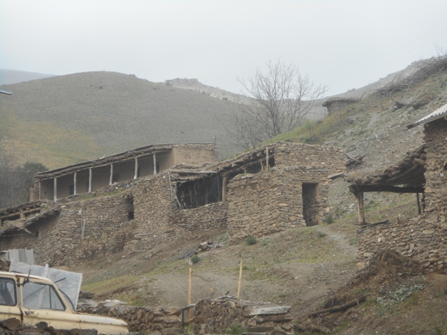 Dans la plaine le temps était ensoleillé mais dès que nous sommes arrivées au village il pleuviote et surtout il souffle un vent glacial. Tout le monde est emmitouflé dans des anoraks. Les bonnets sont enfoncés jusqu’aux oreilles. Avec mon pantalon d’été et mon t-shirt, je gèle. Pas trop envie de sortir. On sort les polaires des valises, les survêtements, les K-Ways. Pour la première exploration dans le village, on nous flanque, d’office, un accompagnateur : Rouslan, 11 ans, des yeux clairs, la peau très claire. Il parle un peu anglais. Après 50m, nous arrivons à un hameau composé de belles fermes et étables en pierre étagées à flanc de coteaux.