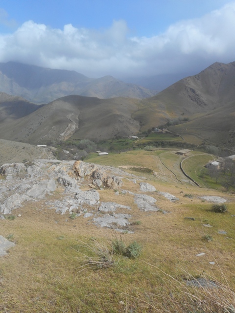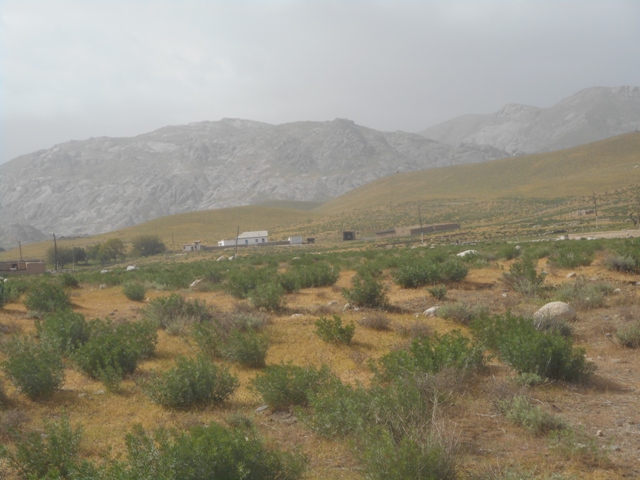 Dans la région, on extrait le marbre. Plus loin, des excavations plus importantes : on cherche de l’or dans les montagnes de Nurata. Entre la route et les montagnes sont alignés de nombreux villages. Impression de bout du monde. Des gens vivent entre la montagne aride et la steppe infinie. Des nuages s’accrochent à la montagne. Voici notre village Uxum ! Tout au moins l’entrée du village. Une piste conduit aux premières maisons puis les évite et entre dans une vallée. La belle Chevrolet de Nasim se comporte bien sur le chemin défoncé. Le village est plutôt une addition de fermes dispersées au flanc de la montagne qu’un bourg organisé.