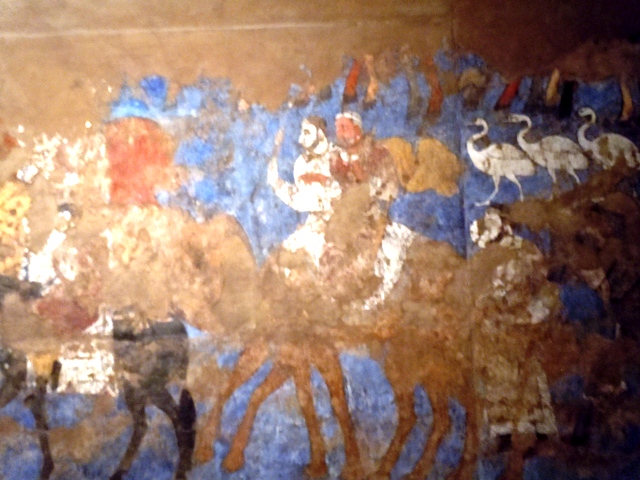 Les ruines les plus spectaculaires sont celles du Palais Sogdien dont on peut observer les fresques qui ont été redéposées dans une salle du musée reproduisant la salle de réception palatiale. Avant d’entrer nous visionnons un document vidéo expliquant les fresques – introduction bien utile : comme nous ne connaissons rien aux Sogdiens et que certaines parties sont abimées, nous n’aurions rien compris.