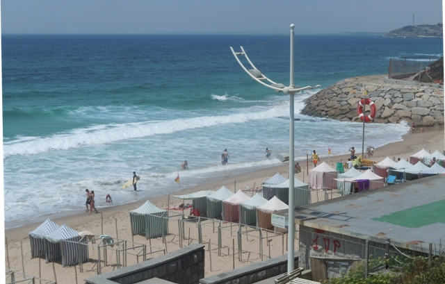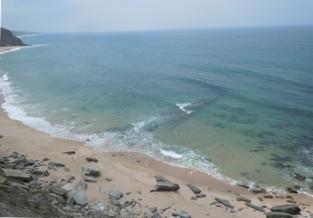 La plage la plus proche, Praia de Areia, ne nous séduit pas au premier abord. Un haut et unique immeuble domine les toits rouges des maisons balnéaires. Le sens unique nous interdit de nous approcher de la plage où des surfeurs s’ébattent dans les vagues. Nous cherchons plus sauvage vers le nord. Une route très étroite court en corniche sur les hautes falaises variant de rouge à vert, en passant par gris à beige là se trouvent les niveaux fossilifères ayant livré les dinosaures. Au pied des falaises, la mer semble tranquille, il y a de belles plages désertes. Personne sur la plage de Caniçal, les aménagements se limitent à une poubelle et deux pancartes, prévenant en 4 langues que la baignade n’est pas surveillée, et avertissant : « chutes de pierres ». Je parcours avec délice le sable vierge avec aussi un pincement d’appréhension : je ne sais pas si la mer monte ou descend. Le sable sec n’existe pas. Au fond de la plage j’ai peur d’être prise dans un piège. Je ne m’attarde pas.