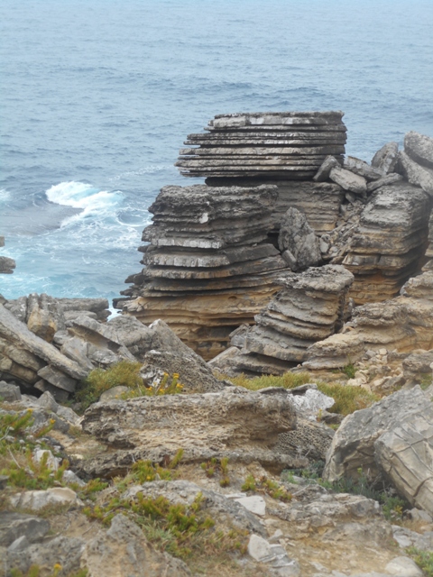 Retour par Peniche. A l’entrée de la ville, on goudronne le rond point, provoquant un embouteillage monstrueux. Que sommes-nous faire ici ? Finalement c’est notre tour et nous poursuivons sur Carvoeiro qui est un curieux affleurement de calcaire gris aux strates horizontales et fines que l’érosion a attaquées dégageant des empilements pittoresques. Au bout du cap se tient un petit phare métallique rouge. Sur l’autre côté, les figures d’érosion sont différentes : lapiaz ? Un GR est tracé, des poissons de bois jaunes signalent les descentes à la mer pour les pêcheurs.