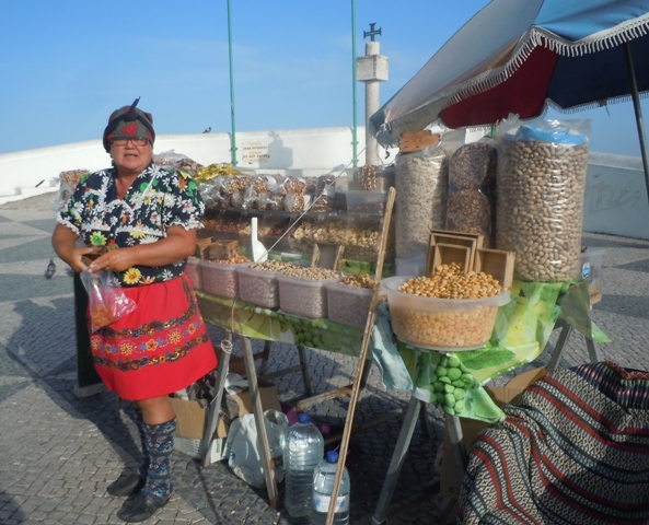 Le dernier côté de la place est le Minadouro point de vue dominant la plage/ Des marchandes de fruits secs, de lupins et d’arachides salées sont habillées en costume traditionnel la jupe courte est gonflée par plusieurs jupons, un foulard à carreaux est noué en turban sur la tête ; Elles attirent les passant en chantant et dansant. Un autre mirador est installé plus haut à l’arrivée de l’ascenseur qui est un funiculaire reliant la plage au Sitio. On surplombe les tentes carrées alignées deux par deux, le sable d’or et l’eau transparente. On voit au fond, le port. Il est loin, le temps où les barques étaient hissées sur le sable, tirées par des bœufs. De vieilles cartes postales témoignent de ces anciennes pratiques.