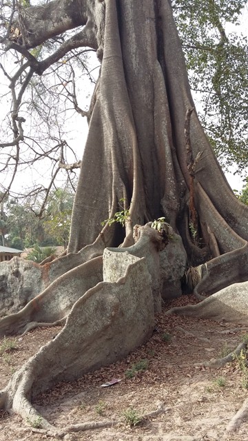 Mlomp est un village diffus. Nous avons à peine dépassé le panneau de signalisation routière que nous retournons dans la campagne. Mor s’arrête au pied de fromagers géants, où Gilbert, le guide local, tout de vert vêtu, nous attendait. Il présente la grande place royale. Un triangle n’a pas été ni balayé ni défriché: l’emplacement royal, intouché, donc plein de mauvaises herbes entoure le fétiche royal. Les trois fromagers sont considérés comme sacrés.