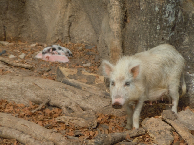 Une truie a mis bas dans le labyrinthe des racines, les porcelets roses ou tachetés ne tiennent pas sur leurs pattes. Je m’approche avec précaution pour la photo, parce que j’ai peur des réactions de la mère « elle va te gronder ». La place sert de lieu d’assemblée pour les hommes et d’arène pour les lutteurs.
