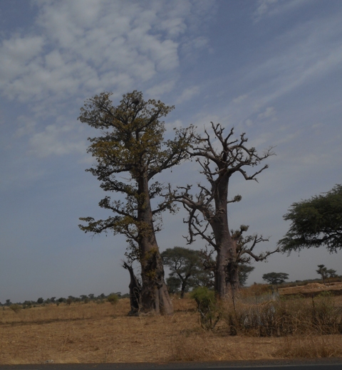 La RN1, route vers le Mali est bondée de lourds camions le plus souvent maliens qui emportent la marchandise à Dakar, désenclavant ainsi le Mali qui ne dispose pas d’accès à la mer. Au mois de février, la campagne est sèche. Les diverses silhouettes des baobabs défeuillés font l’attraction du voyage. Dans les villages il y a partout de petits marchés ou des vendeuses de fruits : melons, oranges. Je remarque les vergers de manguiers mais c’est trop tôt dans la saison.