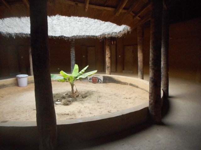 Nous arrivons enfin vers 15h devant la Case à impluvium où nous passerons la nuit. Le campement se compose d’une très grande case ronde en terre et d’une paillote-restaurant plus classique. Sur la place, il y a aussi un petit bâtiment de ciment : « épicerie-bibliothèque ». On entre dans la case à impluvium par une colonnade de 4 troncs de rôniers soutenant un auvent de chaume abritant une entrée cimentée et des bancs. A l’intérieur 10 colonnes supportent une galerie ouverte en son centre – impluvium –où pousse un bananier. Les chambres sont réparties tout autour. Portes de bois sur chambres très sombres. Les lits sont surmontés de moustiquaires. Les draps sont en batik coloré. La petite fenêtre carrée a un volet en osier. Le plafond est tressé. La minuscule salle d’eau est toute noire mais elle a une douche, des WC, lavabo et un rebord de terre pour poser les affaires.