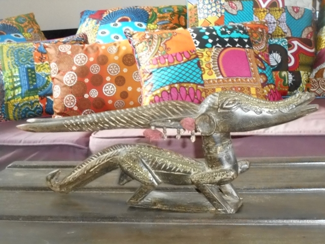 7h : nous logeons dans des chambres d’hôtes « Ambre d’Hôtes », à vrai dire, nous logeons dans une galerie d’art. Tableau et masques sont à vendre, les prix sont étiquetés. Notre chambre « toucouleur » a une belle moustiquaire, un baldaquin, les lampes de chevet sont montées sur des masques de perles. La lampe de bureau est un oiseau de bois brut. Télévision, climatisation, belle salle d’eau carrelée.