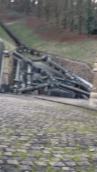 La machine de Marly était construite à flanc d’une pente très raide que nous descendons sur une chaussée très glissante. Il ne reste plus rien des tuyaux et des pompes qui élevaient l’eau. 14 roues à aubes (14 pour Louis 14) installées dans le courant de la Seine actionnaient des pistons reliés par des chaînes. Trois réservoirs étaient nécessaires pour monter l’eau par étape. Au niveau de la Seine on voit les tuyaux. La machine devait faire un bruit infernal!