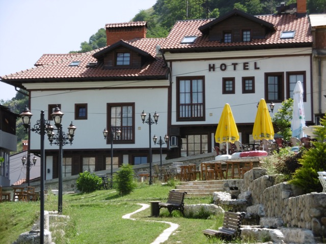 L’Hôtel Prizreni, en face du pont suivant, au début d’une ruelle qui grimpe à la citadelle occupe une maison d’angle biscornue. Au rez de chaussée, un petit bar s’ouvre sur une placette. La réception est au niveau supérieur sur une rue qui monte. Une petite terrasse nous servira d’annexe avec vue sur la ville et la mosquée. Il faut encore monter 6 marches pour accéder à notre chambre dont les fenêtres donnent sur une autre rue en pente et la Mosquée Sinan Pacha. Un géranium rose, une jardinière de zinnias rose et jaune sur le rebord de la fenêtre, plus loin que la mosquée, on distingue une maison jaune à la façade arrondie soulignée par un fronton à degrés aux bords métalliques brillants et au toit à volumes compliqués. Derrière, un clocher avec une petite coupole verte surmontée d’une croix. Juste derrière le mur, des parasols et des lampadaires éclairent le jardin de la mosquée.