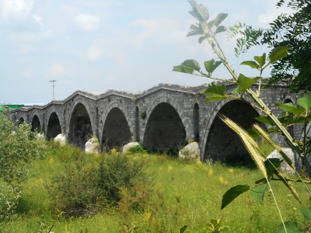 On passe devant un curieux pont aux arêtes anguleuses construisant une sorte de zigzag et on entre dans la ville de Gjakové par le marché très animé, d’abord les pépiniéristes vendent les plants de poivrons et tomates à repiquer, ensuite les marchands de légumes derrière des tomates, aubergines poivrons et oignons de bonne taille. La route traverse ensuite des quartiers modernes sans intérêt. La même route fléchée Prizren, Pristina, est très passante. Le trafic est ralenti par des tracteurs et des curieux engins pétaradants. Nous passons à proximité d’un autre pont ottoman. Je monte sur ce pont avec une curieuse impression d’inconfort, les galets mais surtout ces montées et ces descentes avec des arêtes. Qui pouvait y circuler ? trop étroit pur supporter les automobiles ; mais peut-on imaginer les carrioles sur cette surface brisée d’angles ? En tout cas pas les motos ni les vélos sur les galets !