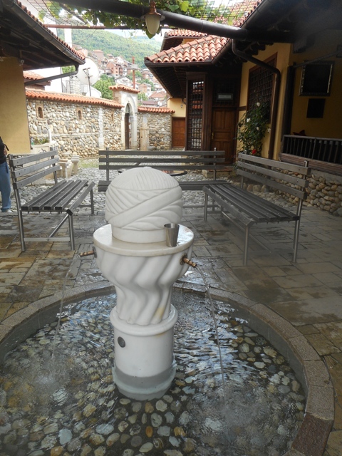 De l’autre côté du vieux pont de pierre, l’Office de Tourisme vend des plans mais dispense peu de conseil. En face se trouve un tekke de derviches du 17ème siècle. La cour et le jardin sont très tranquilles avec deux belles fontaines de marbre et une galerie couverte. Je n’ose pas entrer dans le bâtiment. Les chaussures dans les casiers montrent qu’il y a du monde.