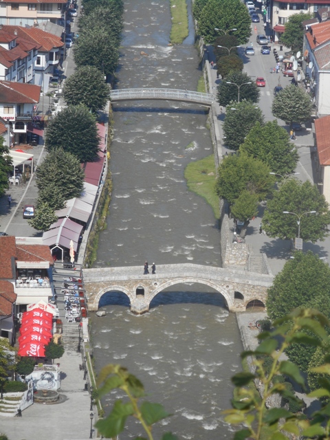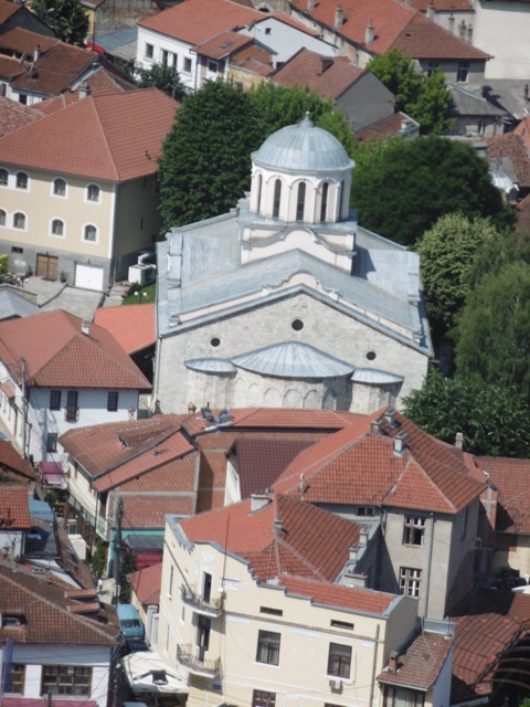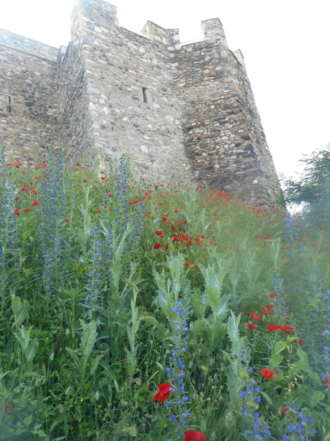 8h45, à l’assaut de la Citadelle. L’église Saint Sauveur est fermée, j’ai eu de la chance hier ! Les murs de la Citadelle se détachent sur le ciel bleu et les arbres. La grille st ouverte sur un chantier de restaurations, la citadelle sera ouverte au public dans 2moi selon un des maçons, il y aura un musée dans les jolies maisons de pierre. Je peux monter sur l’esplanade et de là bénéficier d’un panorama intéressant sur la ville et ses environs. Je découvre le Musée de la Ligue de Prizren et la Mosquée Gazi Mehmet Pacha (16ème siècle), ainsi que les jardins de la Mosquée Sinan Pacha et la fontaine. Du côté opposé à la ville, les restaurateurs n’ont pas relevé les ruines qui sont beaucoup plus romantiques dans les fleurs jaunes, bleues et les coquelicots. C’est un vrai plaisir de flâner à Prizren même si beaucoup de monuments sont fermés, l’observer sous différents angles, dessiner.