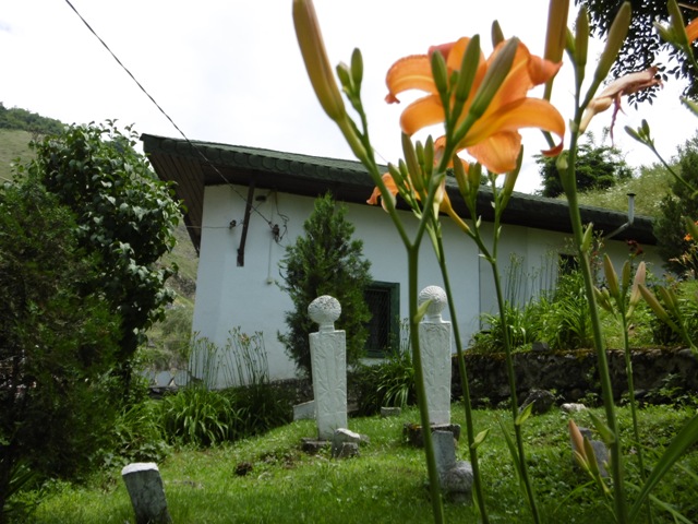 J’entraîne Dominique dans les restaurants des moulins, pour y parvenir on passe devant des maisons ottomanes avec les encorbellements, les balcons soulignés par du bois. La rivière fait un coude Dans le creux se trouve la mosquée Maksul Pasha (17ème siècle ) une grande banderole y annonce le Ramadan. Comme il est bientôt une heure de nombreux vieux messieurs s’y rassemblent, certains sur les bancs dehors, d’autres à la fontaine des ablutions. Un peu plus loin, un platane plus que séculaire vraiment énorme dispense une ombre sur la vaste place. On peut se peser pour 5 centimes d’€ sur un pèse personne public. Un jardin avec des lys rangers et des roses entoure la tombe d’Agliza Baba, un mausolée blanc couvert d’un toit avec un avant toit tout autour de l’édifice rectangulaire arrondi au bout. Deux tombes rondes turques sortent de la floraison des lys. Le restaurant des moulins se trouve un peu plus loin. Malheureusement, les tables près du ruisseau sont plein soleil et il fait bien chaud.
