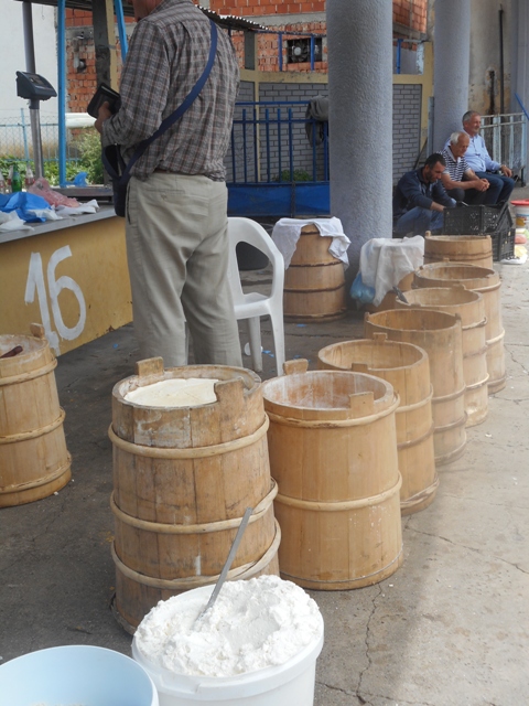 Nous entrons dans le marché où l’on vend des plants de poivrons et de tomates. Les fruits et légumes sont appétissants : courgettes et courges de toutes tailles, tutes sortes de poivrons et piments, concombres…Les pêches et abricots viennent de Grèce, fraises et cerises sont locales. Elles dégagent une odeur forte, c’est pour les confitures tant elles sont mûres. Fromage, crème et yaourts sont présentés dans des seaux en bois un peu coniques. Cela sent aussi très fort.