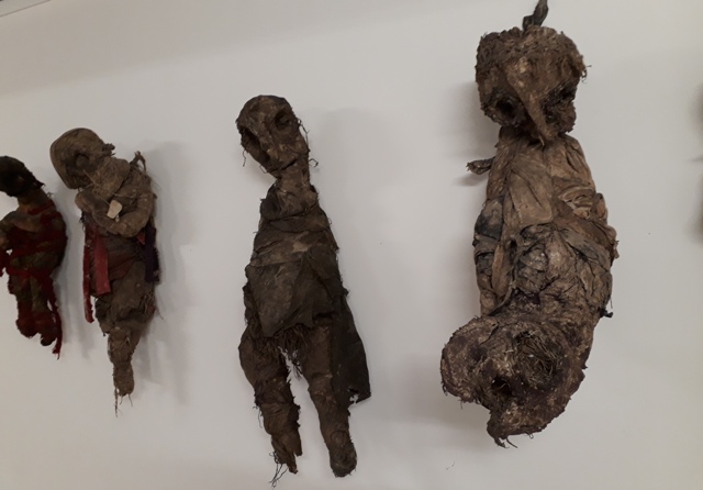 L’oeuvre de Michel Nedjar m’a  beaucoup impressionnée. Nouages symboliques d’objets liés à ses voyages en Afrique ou en Iran mais aussi ces poupées de tissu tout à fait effrayantes qui clôturent l’exposition juste avant la projection de vidéos où les artistes racontent leur travail. Michel Nedjar – dans Les chantiers interdits – livre une clé pour comprendre : il voit dans sa vie un avant et après Nuits et brouillard – tombé dans une profonde dépression il s’enferme pour fabriquer ces poupées qu’il trempe dans un »bain rituel » il les exhume comme s’il exhumait les morts…