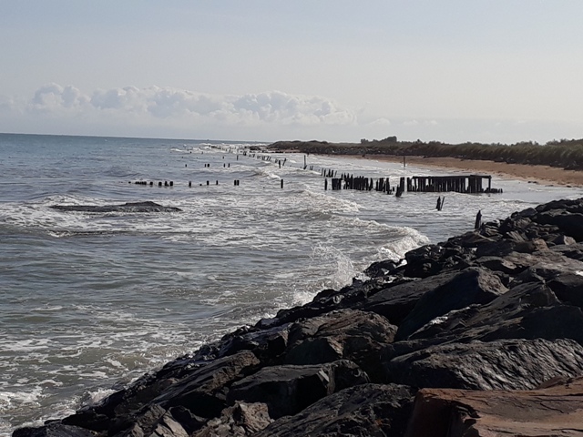 Dimanche matin, il fait beau, j’ai envie de continuer la promenade abandonnée hier soir à Asnelles mais je ne me suis pas renseignée des horaires de marée. La Gold Beach d’Asnelles hier me paraissait immense, mais le coefficient de marrée est élevé (87) et l’eau arrive au ras de la digue, impossible de marcher sur la plage. Je me renseigne avant de partir auprès des pêcheurs, il vaut mieux emprunter le sentier dans le marais puis dans la dune. C’est moins agréable que les pieds dans l’eau mais il n’y a pas le choix ,et puis cela change !
