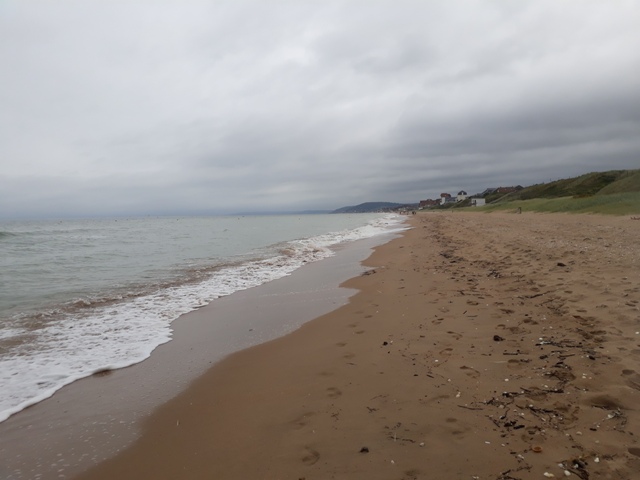 Asnelles, Ver et Meuvaines sont moins chics qu’Arromanches , les maisons en bord de mer sont plus modestes et parfois le dallage de la « corniche » est malaisé et étroit de 50cm mais cela passe . Ce matin, dimanche, je rencontre beaucoup de joggers qui me dépassent allégrement. Après le marais, une dune plantée d’oyat borde la plage qui est en galets. Aucun regret de marcher sur le sentier, les galets ne sont vraiment pas agréables pour marcher (pour nager, j’aime bien parce que l’eau est plus transparente) . Nous nous sommes donné rendez-vous au parking du camping Canadian Scottish de Graye-sur-mer qui est le camping municipal malgré son nom britannique. C’est un camping traditionnel, pas un camp de luxe et c’est bien sympathique. La mer se trouve à 15m.
