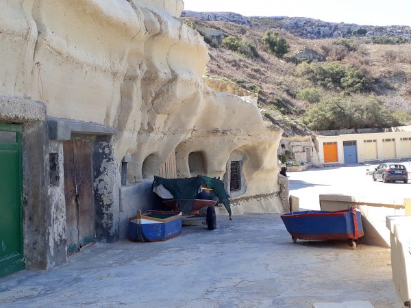 Nous nous promenons dans l’est de l’île de Gozo que nous ne connaissons pas encore. On passe par In-Nadur (2ème ville de l’île) pour trouver la petite baie de Dahlet Qorot. En dessous de la petite route ures maraîchères irriguées sont très soignées : salades, choux et derrière des rangées de cannisses quelques agrumes. Au milieu de la petite vallée serpente une rangée de roseaux, indice d’humidité. Ne éolienne actionne une pompe près d’une citerne. L’éolienne remplit-elle la citerne ou au contraire actionne-t-elle l’irrigation ?