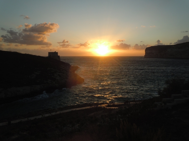 Le soir, nous partons plus tôt qu’hier pour compléter la promenade en haut de la falaise jusqu’à Xlendi. De Munxar, je retrouve rapidement ma promenade matinale. La pente est très raide et il faut bien suivre les points rouges pour ne pas s’égarer et piétiner les petits champs et les jardins. Pour finir la semaine en beauté nous attendons que le soleil se couche entre la tour de Xlendi et la falaise