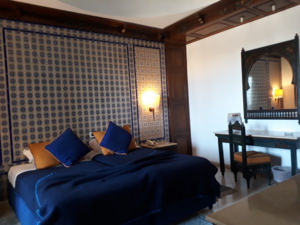 Le hall, aussi imposant que luxueux, s’ouvre sur un patio occupé par une piscine turquoise à débordement, piscine découverte, pas de baignade en cette saison. Notre chambre est un décor des 1001 nuits, majolique jaune et bleue, couvre-lit bleu, coussins jaunes et bleus, boiseries peintes de motifs végétaux comme les tables de nuit à dessus de marbre, table de marbre. Tapis Kairouan, bien sûr, rebrodés dans les tons verts et bleus, sur fond gris. Au plafond, une coupole chaulée blanche encâdrée par une corniche de bois foncé peinte avec une vigne ondulante. La salle de bains est carrelée de majolique verte et jaune, spacieuse. Une petite terrasse vitrée meublée de deux fauteuils et une table ronde.