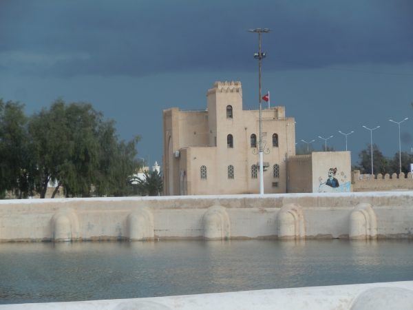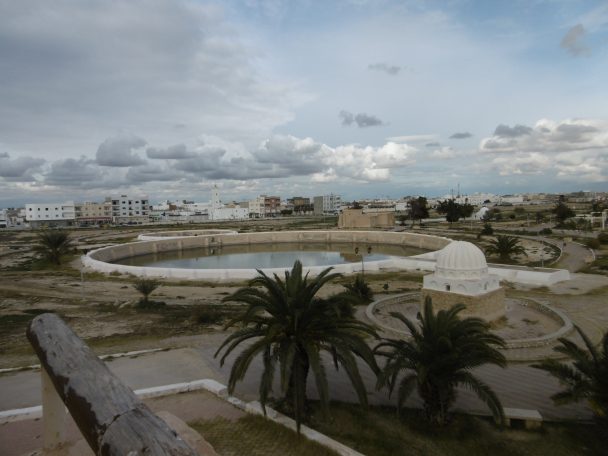 Les bassins des Aghlabites sont des réservoirs construits au 9ème siècle pour approvisionner la ville en eau. L’Office de Tourisme se trouve à proximité. On peut monter sur la terrasse pour avoir une vue aérienne. Deux grands bassins ronds sont chacun reliés à un petit. (Cette forme me rappelle le bassin dans lequel je suis tombée au Désert Blanc en Egypte). Sous quelques arbres clairsemés un homme promène un mouton, « c’est un mouton de combat » déclare le vieil homme qui s’est proposé pour être notre guide, mais que nous n’avons pas agréé comme tel (il est collant, gâteux et s’exprime mal en français). Le « mouton » porte des cornes enroulées. Nous fuyons le vieux collant et entrons dans le parc. L’entrée est devant Monoprix, c’est un parc ouvert au public. Le ciel est maintenant noir, les bassins cerclés de blanc, les petites coupoles se détachent bien.