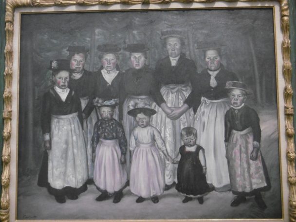 Les débuts de l’artiste en France (1922-125) sont représenté par des portraits très sombres, visages gris,  fermés, rehaussés de carmin des personnages habillés et coiffés de noir, de la Promenade du dimanche au Tyrol. Le Portrait de ma concierge n’est pas plus riant, la vieille femme a un visage gris verdâtre, des mains noueuse violacées. Trois  vieilles femmes sont très expressives mais toujours aussi sinistres. pas gai, mais saisissant!