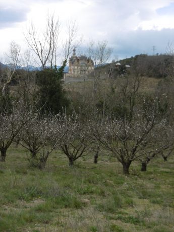Les flèches chemin de Vivès  balisent un circuit d’une douzaine de km, 3 heures prévues. Les membres du club sont très entraînés.  Partis à plat autour d’un château tarabiscoté, sur un rythme soutenu. La piste monte dans la colline. Le groupe accélère dans la montée. Je me force à rester devant de peur d’être distancée. Avec ma parka, j’ai vraiment très chaud.Je la roule dans mon petit sac et marche avec le pull irlandais. Au loin, sur la colline, je reconnais l’Ermitage de Saint Ferréol .