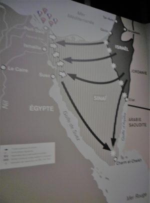 la suite de l’exposition détaille les guerres israélo-égyptiennes des Six jours et de Kippour avec des cartes et des témoignages de vidéos : interviews et films égyptiens : dans les « petits rêves » on voit la démission de Nasser à la suite de la Guerre des 6 jours et les manifestations de soutien au Rais de la population.