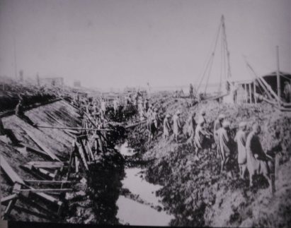 La construction du Canal eut d’abord recours à la Corvée : le khédive mit disposition 25000 fellahs qui ne disposaient que d’outils rudimentaires et qui mourraient par milliers. Des photos et un film égyptien montrent les conditions déplorables des hommes qui moururent par dizaines de milliers. Les britanniques dénoncèrent cet esclavagisme et Napoléon III obtient en 1864 l’abolition de la Corvée. En plus du creusement il fallait draguer le canal pour éviter l’ensablement : une maquette de dragueuse à godet est sous une vitrine tandis que des vidéos montrent son fonctionnement.