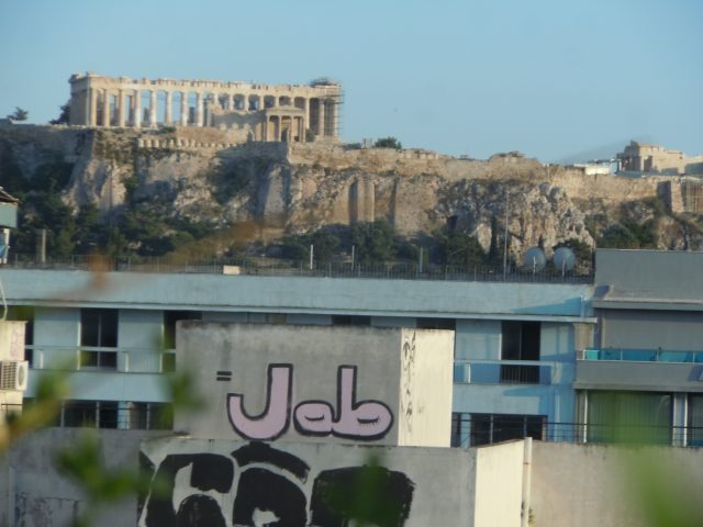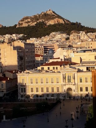 La chambre 604 a un petit balcon sur la grande Place où se trouve la Mairie, bâtiment néo-classique jaune pâle. Rectangle dallé qui se termine par un site archéologique : le Cimetière acharnien qu’on ne visite pas mais qui est visible de la dalle. En face de la Mairie, la Banque de Grèce est aussi une construction jaune à corniches néo-classiques.