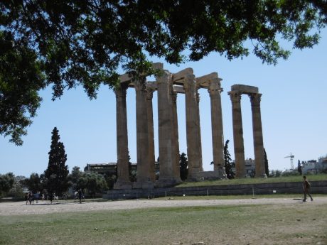 En revanche j’arrive à l’Olympéion Temple de Zeus Olympien. Il est fini le temps où je présentais ma carte professionnelle et où avec deux ou trois mots de Grec, j’entrais gratuitement dans les sites ! Pour obtenir la réduction senior je dois sortir ma Carte d’Identité dument inspectée. La construction du temple fut initiée par Pisistrate, le petit fils du tyran en 515av JC sur le site d’une construction archaïque. Elle fut interrompue en 508 après la chute du tyran. C’était un monument gigantesque d’ordre dorique en calcaire sur le modèle des temples d’Asie Mineure. Construit en marbre au 4ème siècle il resta inachevé, puis il fut reconstruit par les Romains et complété par l’Arc de Triomphe d’Hadrien. 104 colonnes était encore debout en 1852. Sur une vaste esplanade un peu chauve, les colonnes restantes sont gigantesques ; j’ai déjà entendu ce refrain à Agrigente (encore un temple de Zeus avec ces géants les Télamones. Le gigantisme sied à Zeus ! L’Arc de Triomphe d’Hadrien est plutôt gracile pour un monument romain, original avec ses deux parties superposées très différentes.