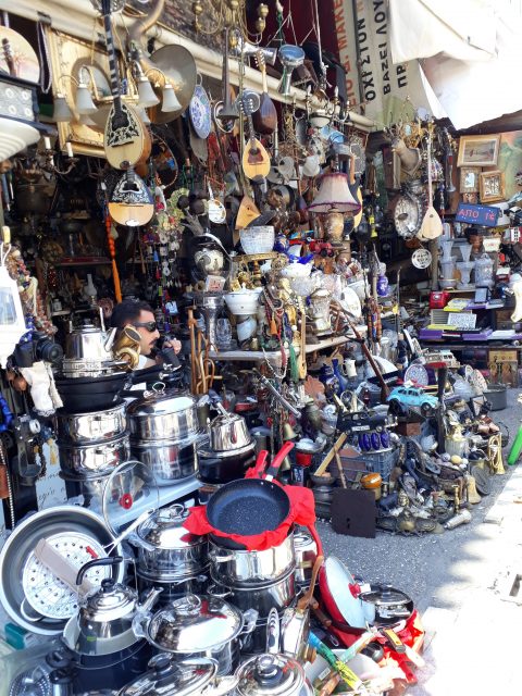 Retour par Plaka avec ses restaurants, ses boutiques de pacotille ; cette année des bottes à lanières – sandales qui s’enroulent jusqu’au mollet, ses écharpes de mousselines, le linge de toilette et les ponces teintées de couleurs criardes à destination des touristes attablés aux « happy hours ».