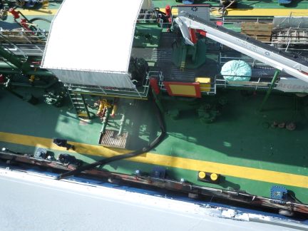 A 19h05 le ferry accoste et se vide rapidement. Casiers séparés pour les valises selon les destinations. Aegiali est l’avant dernier arrêt. Nous nous installons à l’ombre sur le pont. Un petit pétrolier s’installe contre la coque du ferry qui fait le plein de carburant pendant une bonne demi-heure. Je ne suis toujours pas arrivée à joindre le logeur pour le prévenir de notre retard.