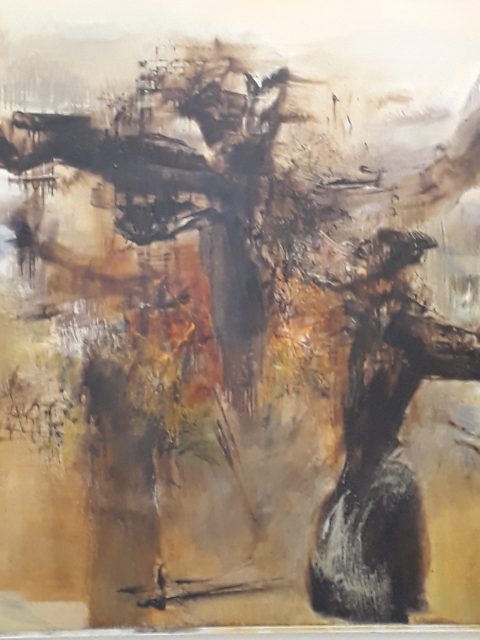 L’Hommage à André Malraux est un grand triptyque sur fond doré où des personnages ressemblent à des éléments de la calligraphie chinoise.  Le peintre chinois doit à Malraux, l’auteur de la Condition Humaine, l’acquisition de la nationalité française. je ne sais si ce tableau est abstrait ou pas. j’y distingue ds personnages de larges traits à la brosse noire