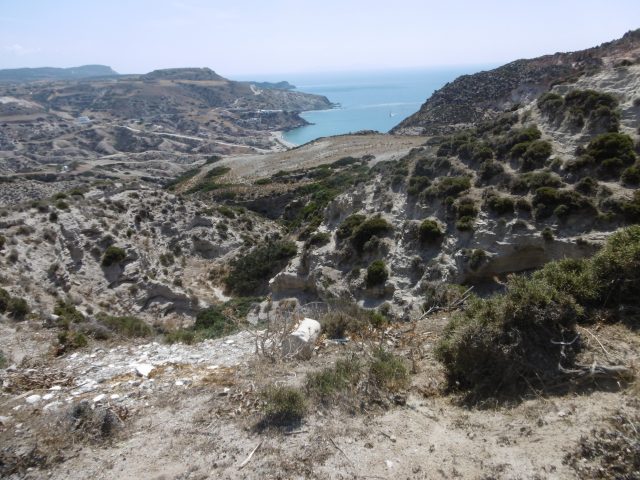 Après la traversée du cratère, la piste remonte sur les rebords et je découvre le phénomène le plus étonnant : des fumerolles et des dépôts de soufre près de l’évent. Bien que le volcan soit éteint depuis 90.000 ans, ces fumerolles comme les sources hydrothermales sont la preuve de la présence de magma encore chaud. On a voulu utiliser la géothermie à Milos, mais je ne sais pas où c e projet en est. Au sommet du petit dôme, on a installé des antennes.