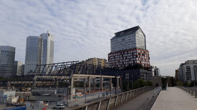 Le Trapèze est un quartier contemporain très tranquille et très agréable – le plus vaste écoquartier de Paris – selon un site qui organise des balades guidées que je suivrais volontiers : je ne sais pas comment fonctionne un écoquartier et cela m’intéresse. L’allée Robert Doisneau qui le traverse est piétonnière, elle est bordée de résidences, petits immeubles construits autour d’allées paysagées arborées mais fermées par des grilles avec digicodes. Les façades sont variées, pas une qui copie la voisine comme si souvent dans les ensembles modernes, des balcons métalliques la surplombent, certaines façades métalliques et perforées sont particulièrement réussies. Les équipements collectifs municipaux sont intégrés et discrets, je remarque une médiathèque, un gymnase et une école primaire « à projet spécifique anglais« , sur Internet j’ai trouvé un un groupe scolaire de la biodiversité avec un mur végétal mais je ne l’ai pas vu. Le parc public est malheureusement bien sec et l’herbe ressemble à un paillasson.