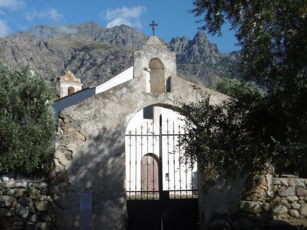 Après être passées devant des tombes monumentales à la sortie de Calenzana, la Chapelle Sainte Restitude se trouve à 1km à l’écart du village dans une oliveraie ; Les arbres sont impressionnants avec leurs troncs creux. Juste après notre arrivée, la pluie se met à tomber. La chapelle est beaucoup plus grande et plus baroque que prévue (commencée au 11ème siècle elle a été restaurée ultérieurement, le chœur est surmonté d’une coupole octogonale 18ème siècle),